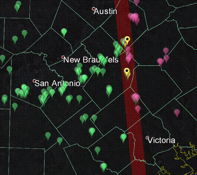 I will acknowledge here that the absence of data is not data, but my conclusions in these areas of overlap area based on numerous samples at various times, not just single points. Here's a map of my recording locations going east of San Antonio 150 miles or so. Hyla chrysoscelis (green pins) is the only species heard until you get about 75 miles east of San Antonio then suddenly you hear nothing but Hyla versicolor (pink pins). The few places I have heard the two species calling together are marked with yellow pins.