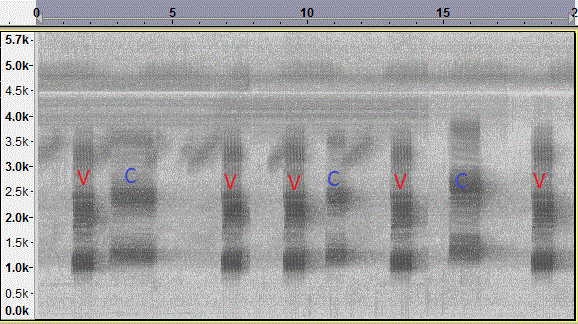 When you do hear them together in areas where there ranges overlap, you can hear the difference pretty clearly. Here is a spectrograph of a recording I made in Davy Crockett National Forest in East Texas. What you see is a Hyla versicolor being answered by a Hyla chrysoscelis (maybe 2?). I have labeled each species calls (v for versicolor, c for chrysoscelis).